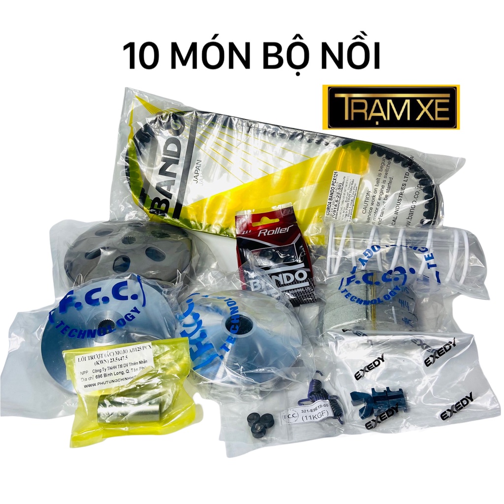 TRỌN BỘ GỒM: 1. CHUÔNG NỒI FCC 2. BỐ BA CÀNG FCC 3. ẮT NỒI MOJO 4. CHÉN BI + CÁNH QUẠT FCC (Các dòng xe Ab 110, Click 110, Lead 110, Vision đời 2012 2013 sẽ không có quạt nồi, vì cấu tạo các dòng xe này dùng đĩa ép bằng thép rất khó bị hư hỏng để phải thay) 5. KẸP TRƯỢT EXEDY 6. LÒ XO TRỤ FCC 7 LÒ XO 3 CÀNG FCC 8. CAO SU 3 CÀNG FCC 9. BI NỒI BANDO 10. DÂY CUROA BANDO