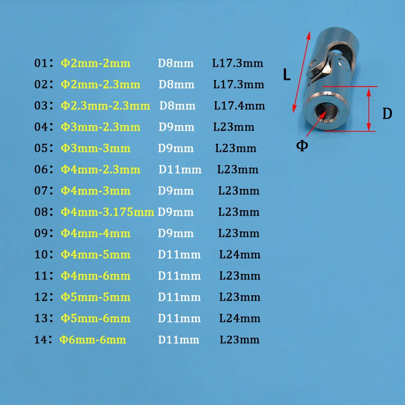 Trục Cardan Kèm Lục Năng (Khớp nối mềm - Khớp nối động - Khớp Nối Trục Khuỷu Động) CÔNG DỤNG: - Thích hợp cho: Sử dụng trục động cơ thẳng, và chuyển giao kim loại khác nhau như xe mô hình, thuyền mô hình, robot... - Khớp nối giữa motor và trục truyền động. - Khớp nối trục cardan được thiết kế tại khớp liên kết với góc quay tối đa β = 45 độ, nên sẽ rất an toàn cho thiết bị nếu trục liên kết không đồng tâm vẫn có thể truyền động tốt. - Loại 2 khớp. Có các tuỳ chọn lỗ: 2 - 3mm 2.3 - 3.17mm 3.17 - 4mm 4 - 5mm 5 - 5mm