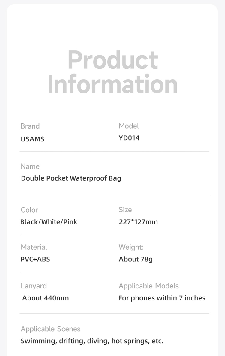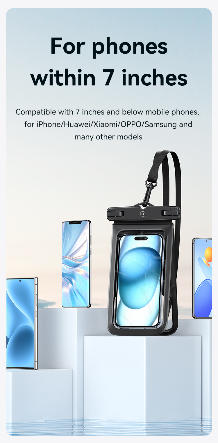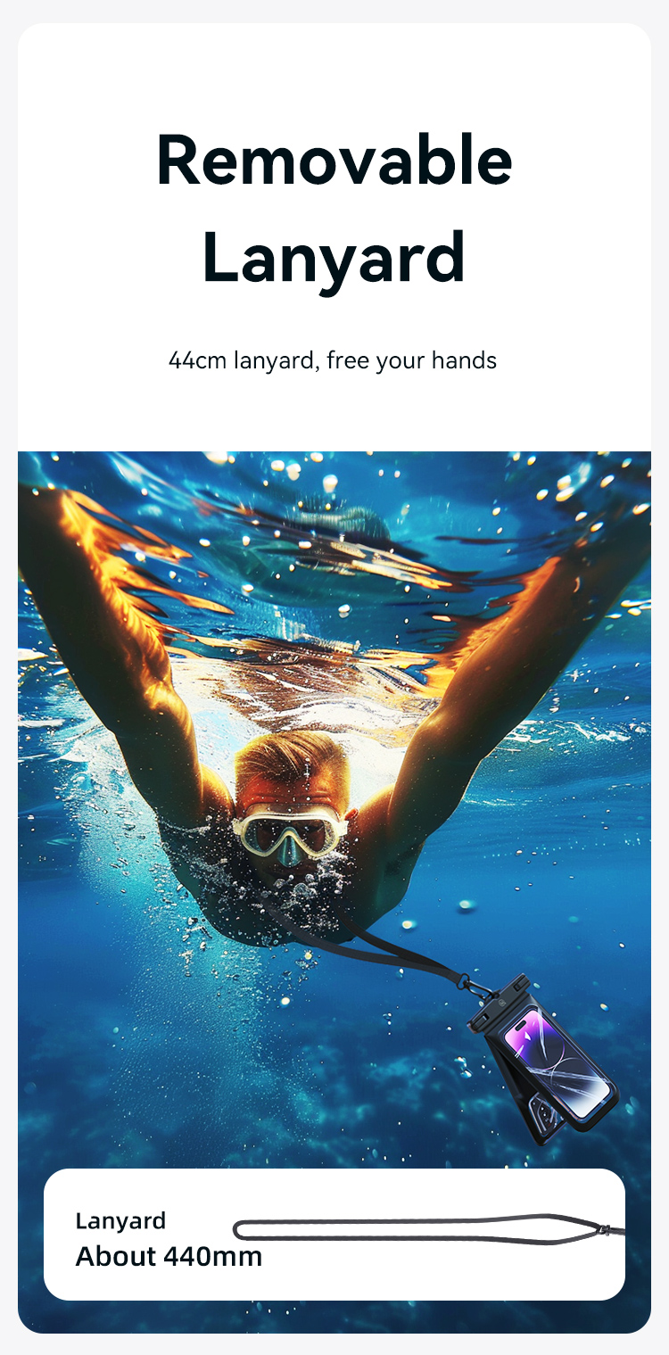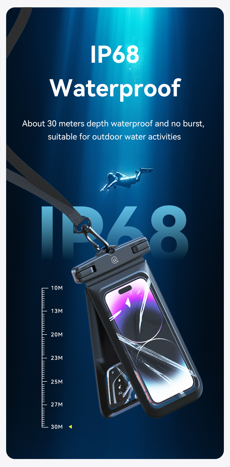 Túi được thiết kế với tiêu chuẩn chống nước IP68, giúp bảo vệ điện thoại của bạn khỏi nước ở độ sâu lên đến 1.5 mét trong thời gian dài, lý tưởng cho những chuyến đi biển hay các hoạt động thể thao dưới nước.
