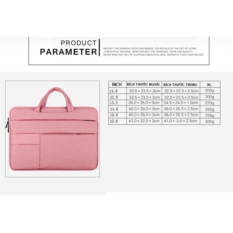KÍCH THƯỚC: Kích thước bên ngoài túi, khi chưa đựng máy Túi 14inch : 40 x 28 x 3 (cm) Túi 15.6inch : 43 x 32 x 3 (cm)