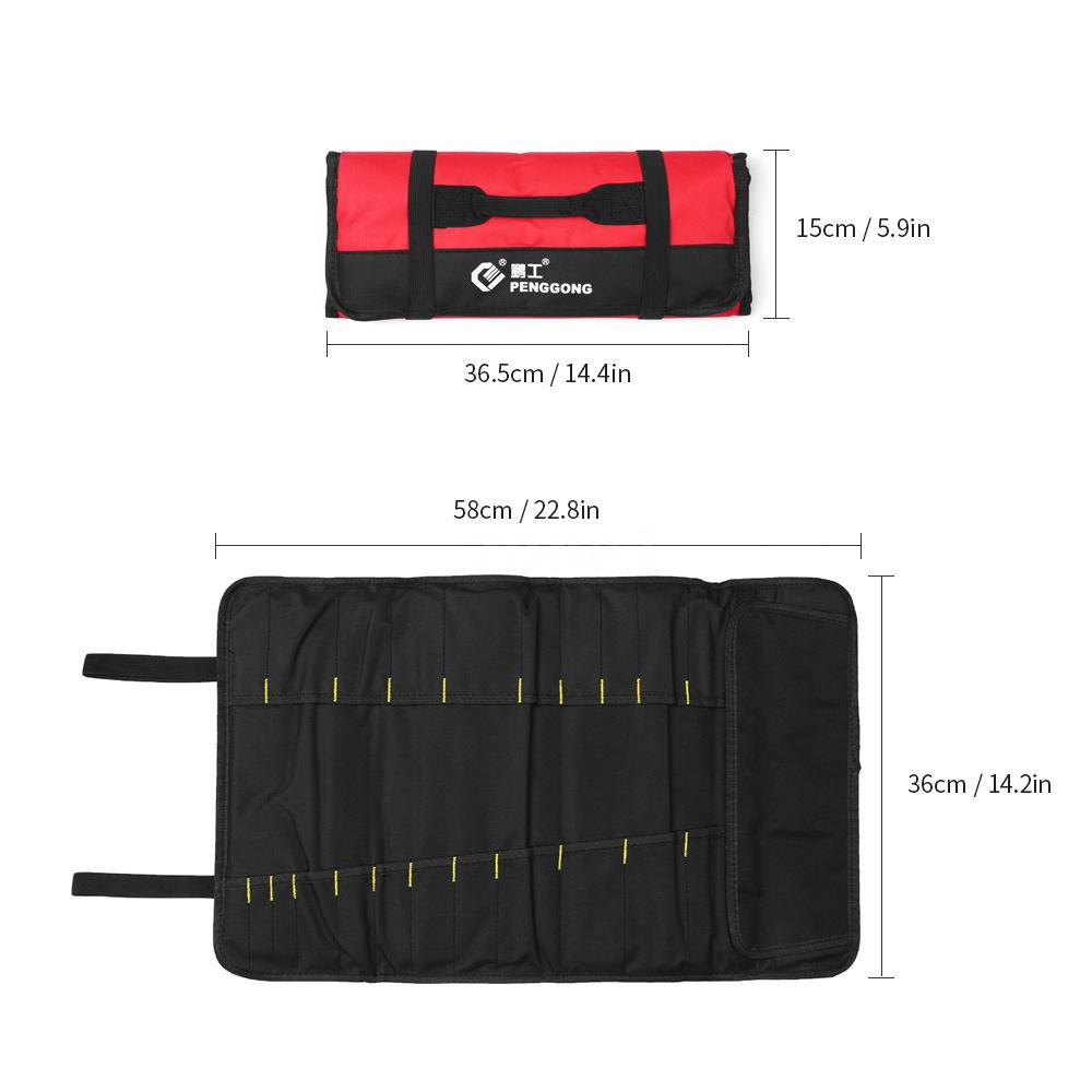 Specifications: Brand Name: PENGGONG Color: Red / Green / Blue / Black (Optional) Material: 600D Oxford Fabric Type: Coiling Block Type Unfolding Size: Approx. 58 * 36cm / 22.83 * 14.17in(L * W) Folded Size: Approx. 36.5 * 15cm / 14.37 * 5.91in Product Weight: 241g / 8.50oz Package Size: Approx. 36.5 * 15 * 4cm / 14.37 * 5.91 * 1.57in Package Weight: 249g / 8.78oz Note: Only Tool Bag Included. The tools in pictures are not included.