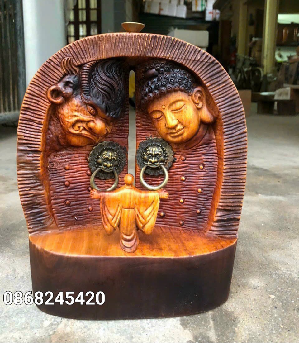 _ Tượng cánh cửa thiện ác được làm bằng chất liệu gỗ hương đá liền khối tự nhiên 100%Và được sơn pu giả cổ
