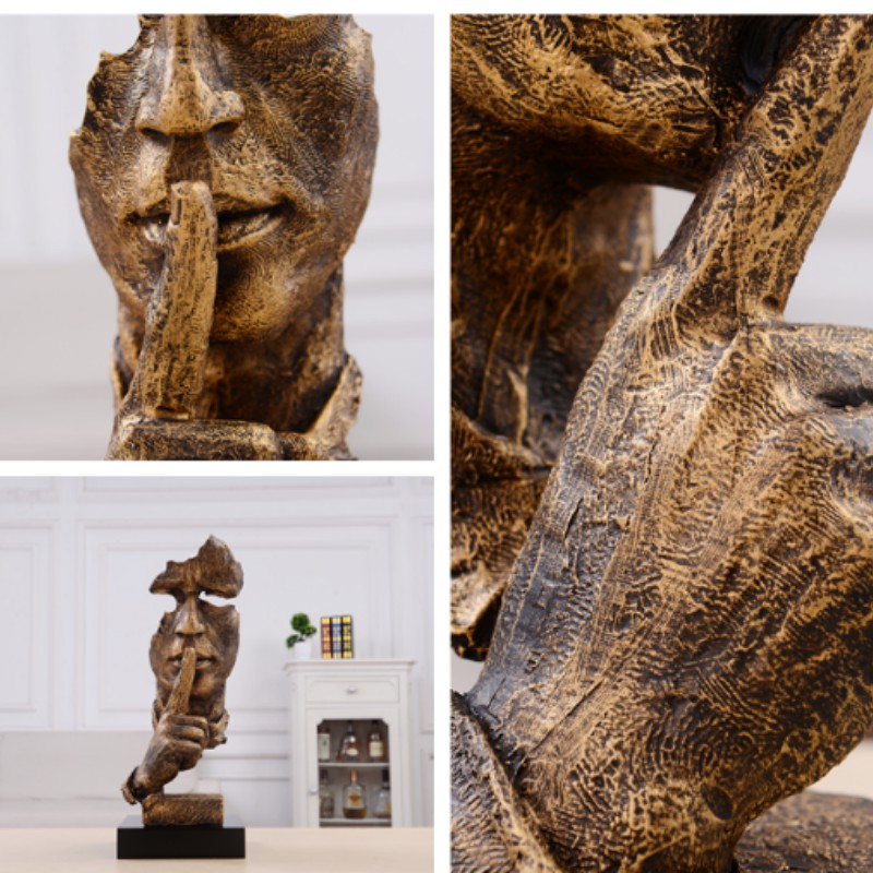 Tượng thiết kế độc - lạ ngay từ cái nhìn đầu tiên về sản phẩm, đó không phải là một bức tranh hoàn thiện hay đầy đủ hết. Khoảng trong rỗng, giống như một lớp mặt nạ đơn giản nhưng phản ánh được mọi chân lý của cuộc sống hiện đại. Ngón tay trỏ đặt lên miệng, làm hành động “suỵt”, im lặng để lòng thảnh thơi. Tượng mặt người tĩnh sử dụng lối thiết kế độc đáo, kết hợp màu sắc hài hòa và kích thước gọn gàng nên được dùng để trang trí trong nhiều không gian khác nhau. Gam màu vàng – đen trộn lẫn với nhau, một sáng – một tối rất độc đáo và thú vị. Tay găn liền với bệ đỡ tạo tính nghệ thuật, đồng thời cũng là giá đỡ chắc chắn cho bức tượng. Ý nghĩa của sản phẩm: Bức tượng thể hiện sâu sắc triết lý “Im lặng là vàng”, đó là im lặng để cùng lắng nghe mọi thứ đang diễn ra như thế nào? Im lặng là để cảm nhận mọi sự vận động và để có thể thấu hiểu được sự việc, con người xung quanh dễ dàng hơn, tốt hơn. Im lặng cũng là để giúp cho bản thân mình trưởng thành hơn, chín chắn hơn. Với ý nghĩa sâu sắc đó, bức tượng mang đến những triết lý, cảm nhận và sự suy tư, tư duy sâu xa dành cho người nhìn. Mối khi làm việc gì không nên, nhìn bức tượng sẽ khiến ta cảm thấy lòng bìn yên và thảnh thơi hơn.