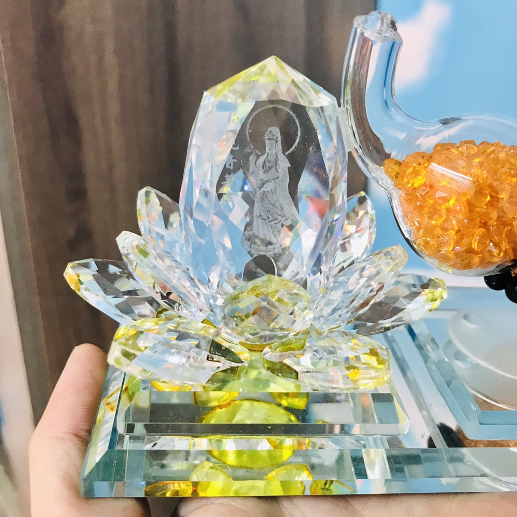 TƯỢNG QUAN ÂM HỒ LÔ"Thuyết kinh, nhất đóa nhất tòa. Thơm lừng hương pháp, phật bà hóa duyên" chính là hình ảnh Quan Thế Âm Bồ Tát tọa sen hạ trần, ra tay cứu vớt chúng sinh lầm than, ban phước lành. Hình ảnh đẹp đẽ ấy đã được tái hiện lại trong sản phẩm tượng Quan Âm phong thủy. Tượng được làm từ pha lê khối, chạm khắc tinh xảo. Các chi tiết góc cạnh kết hợp tài tình, tỉ mỉ nên khi mặt trời chiếu vào, sẽ tạo ra những tia sáng lấp lánh, cực kì huyền ảo.
