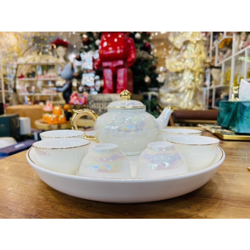 Giới thiệu Bộ uống trà,ấm chén 7 Sắc Trắng Viền Vẽ Vàng kèm khay Gốm Sứ Giang Tây cao cấp quà tặng ý nghĩa