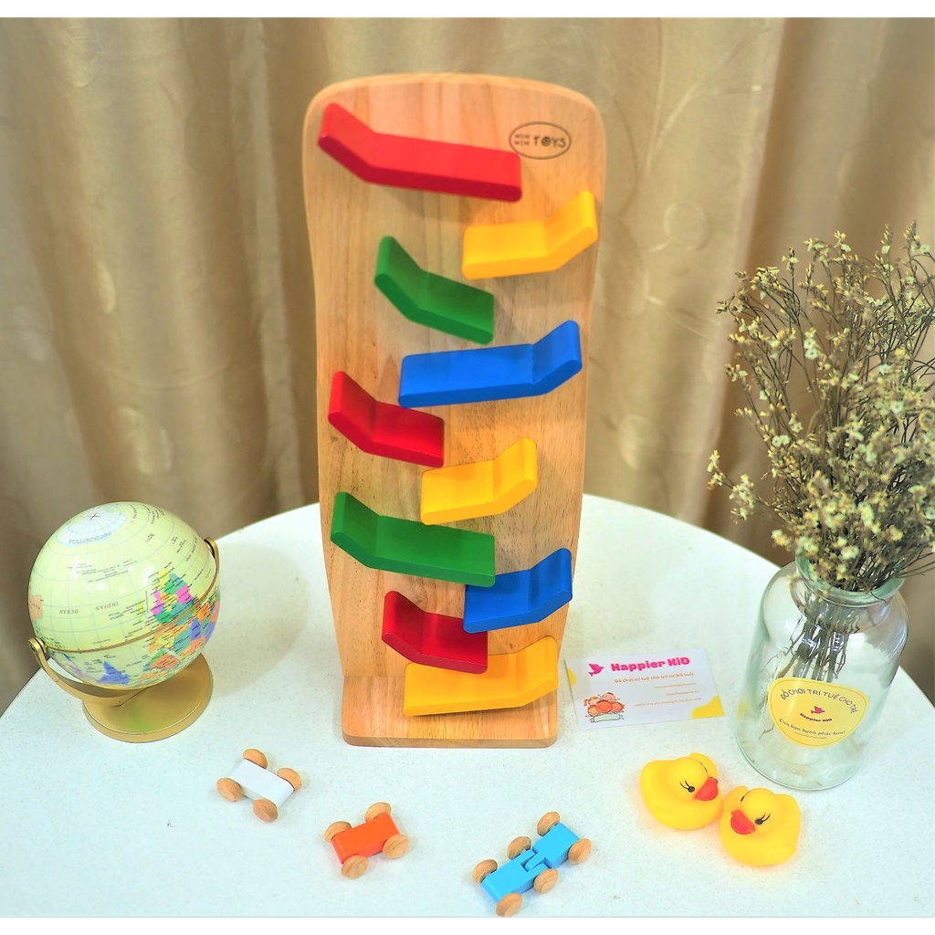 Đường đua gồ ghề, nhiều màu sắc như một chuỗi dzic dzac quanh co, uốn lượn thật lạ lẫm. Đây là trò chơi động, kích thích tính tò mò, ưa khám phá những điều mới lạ của các bé, giúp bé phát triển khả năng sáng tạo, tính kiên nhẫn và kỹ năng khéo léo khi thả các chiếc xe sao cho đồng bộ trên vách trượt để xe chạy về đích mà không bị văng ra ngoài.
