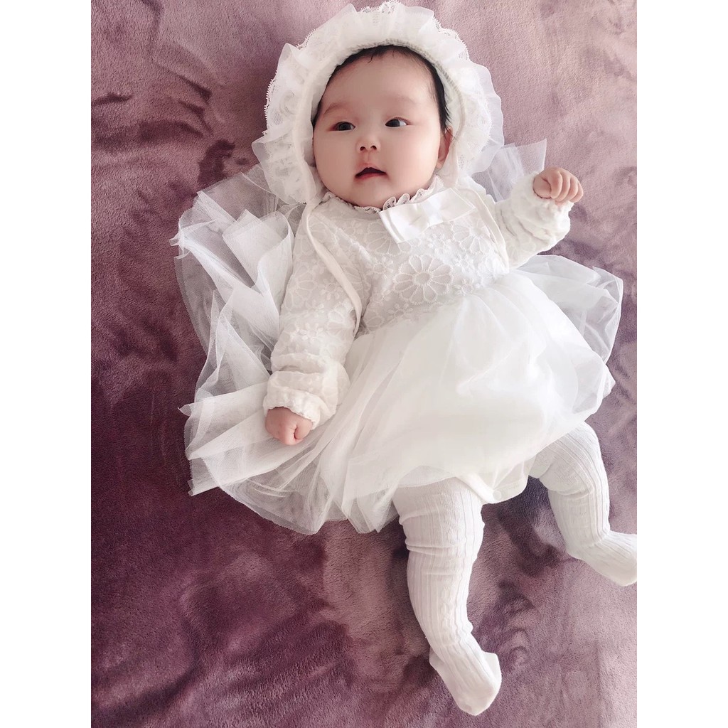 Giới thiệu Váy công chúa trắng thêu hoa đầy tháng/ thôi nôi cho bé gái (kèm mũ bèo tiểu thư)