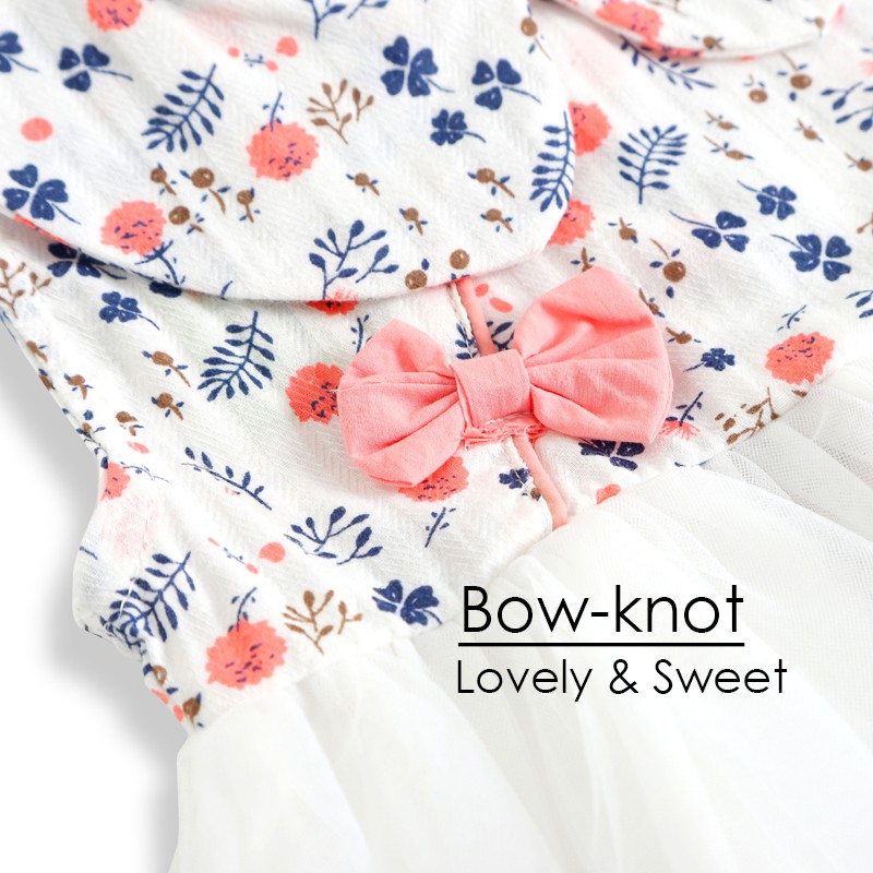 It is a cute summer dress for 0-4 years old kids with sleeveless and zipper top which make it easy to wear for baby. The doll collar and floral pattern top attached a bow-knot give a cute looking. The color and the flower pattern is retro.