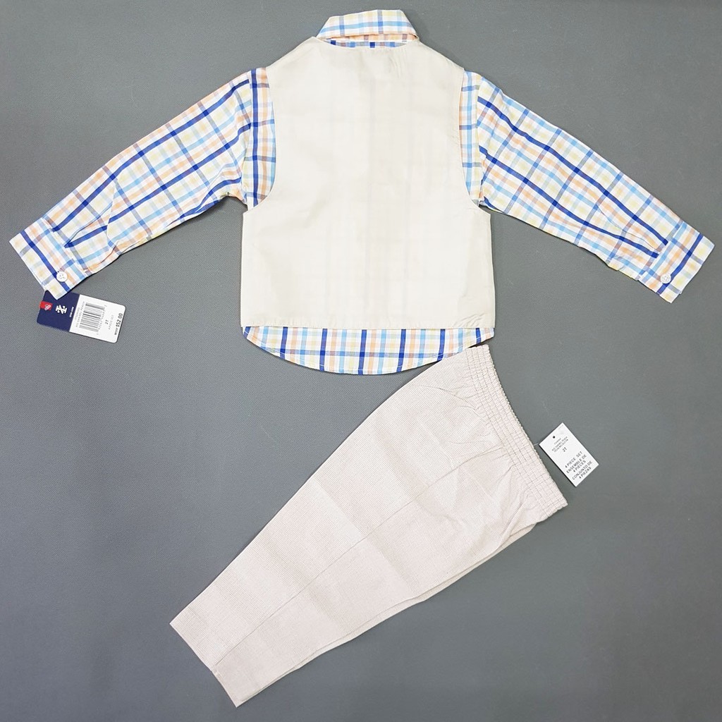 Bộ vest gile 4 món phong cách tây âu hàng xuất xịn Set bộ Vest bé trai 4 món (áo sơ mi + ghi lê + cava hoac nơ tùy mẫu + quần tây) IZOD , size 3/6m - 14t. Việt Nam xuất xịn. * Hàng date mới 2019 * Gía Web: $27.84 = 640.000VND, giá tag 42-65$, Giá shop 320.000 vnd 1 bộ * Áo ghi - lê: chất vải mềm mại, mịn tay. Màu sắc rất sang. * Áo sơ mi: chất vải kate mềm, mịn, cấu tạo sợi vải thoáng mát, cho bé thoải mái khi mặc. Đường may tinh xảo. Tông màu tươi sáng , phối họa tiết kẻ sọc caro nổi bật, rất Tây. * Quần: chất vải sờ vào rất mướt tay. Lưng thun êm mềm, co giãn không gây cấn bụng bé. * Bé diện nguyên set cực sang chảnh và manly ạ bộ thích hợp cho bé thân hình chuẩn, thon, có chiều cao. Lưu ý; với size đại dành cho các bé lớn, quần lưng bản dây kéo ( size 8,10,12,14) các size bé quần lưng thun. * size 8: ngang lưng 31cm, dài quần 79cm * size 10, ngang lưng 33-33,5cm, dài quần 83cm * size 12, ngang lưng 35cm, dài quần 95cm * size 2,3,4,5,6,7 quần lưng thun ngang eo từ 24-27cm dài quần 46-68cm Mã sản phẩm BT-1022C Giá 320,000 ₫ Bảng kích cỡ 2 bé 10-12kg, 12-18 tháng 4 bé 13-16kg, 2-3 tuổi 5 bé 16-18kg, 3-4 tuổi 6 bé 18-10kg 4-5 tuổi 8 bé 21-26kg, 5-7 tuổi 10 bé 27-32kg 7-9 tuổi