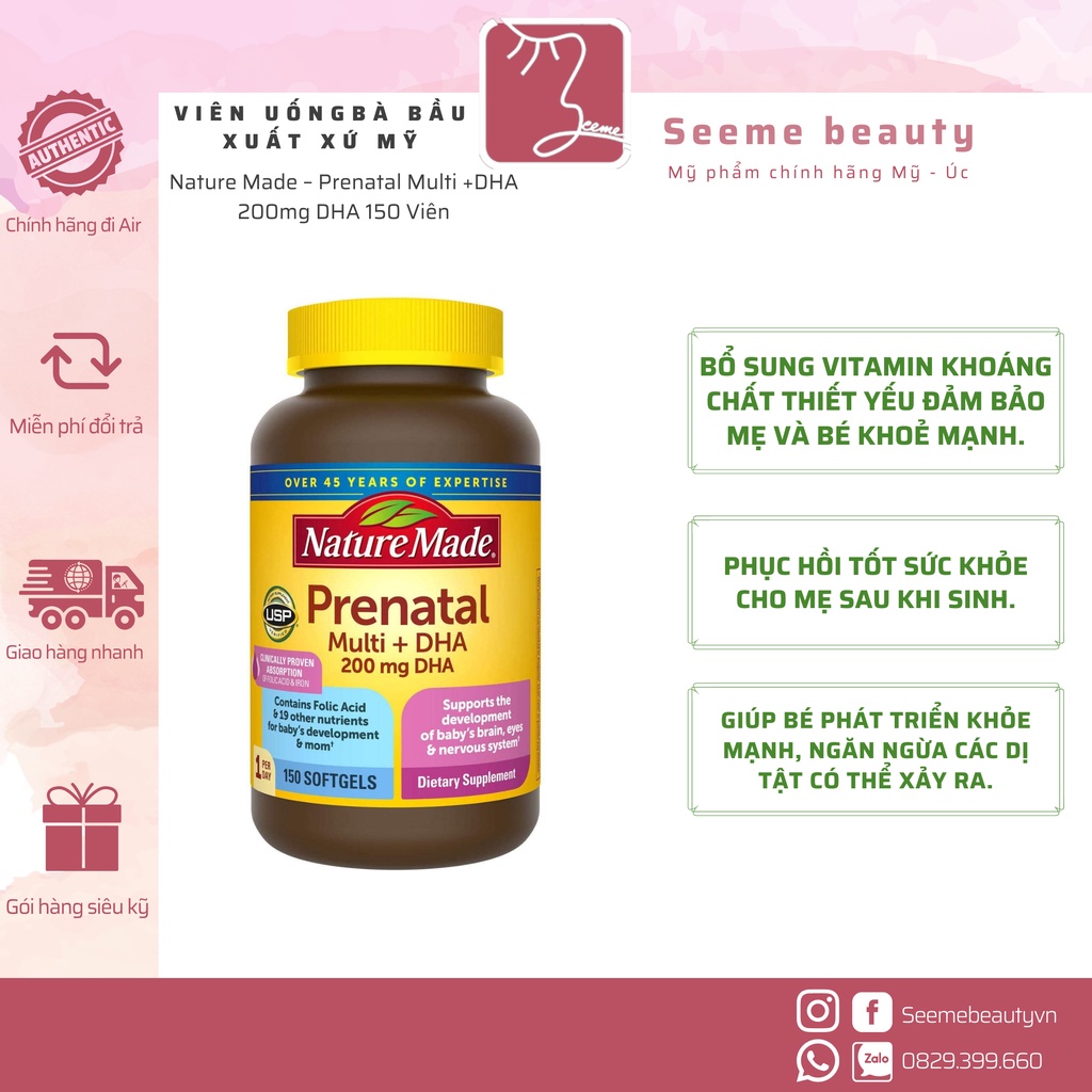 Giới thiệu [Bill Mỹ] Viên Uống Vitamin Mẹ Bầu Nature Made Prenatal Multi DHA 150 Viên SeeMe beauty VE-002