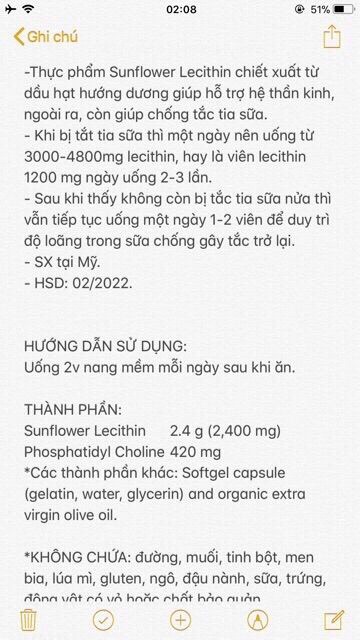 * THông tin: Viên uống chống tắc tia sữa Lecithin 1200mg - Now Sunflower Lecithin - Lecithin là chất chiết xuất từ hạt hướng dương, giúp sữa giảm kết dính ko đóng thành cục gây tắc tia sữa. - heo KellyMom - trang web nước ngoài nổi tiếng về sữa mẹ. Khi bị tắc tia sữa, 1 ngày nên uống từ 3000-4800 mg lecithin - Uống kèm massa ngực để làm tan những cục sữa cũ cho tới khi tan hẳn. Sữa mới khi mẹ uống Lecithin sẽ ko đóng vào cục đó nữa - Sản phẩm này không phải là thuốc và không có tác dụng thay thế thuốc chữa bệnh