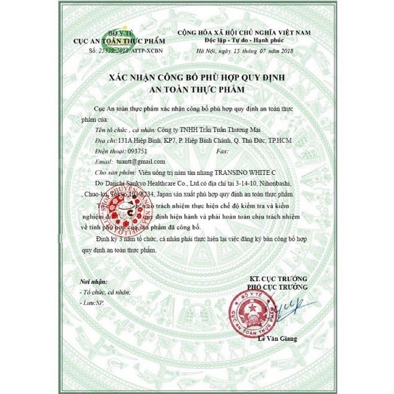 Công dụng của Transino Giảm hình thành của sắc tố Melanin, từ đó làm mờ các vết đốm, tàn nhang để da được trắng sáng, đều màu. Phục hồi và bảo vệ làn da bị tổn thương do ánh nắng mặt trời. Hỗ trợ thanh lọc và đào thải độc tố trong cơ thể, từ đó giảm tình trạng nổi mụn. Hỗ trợ tái tạo làn da, cung cấp độ ẩm cho da mịn màng, mềm mại.