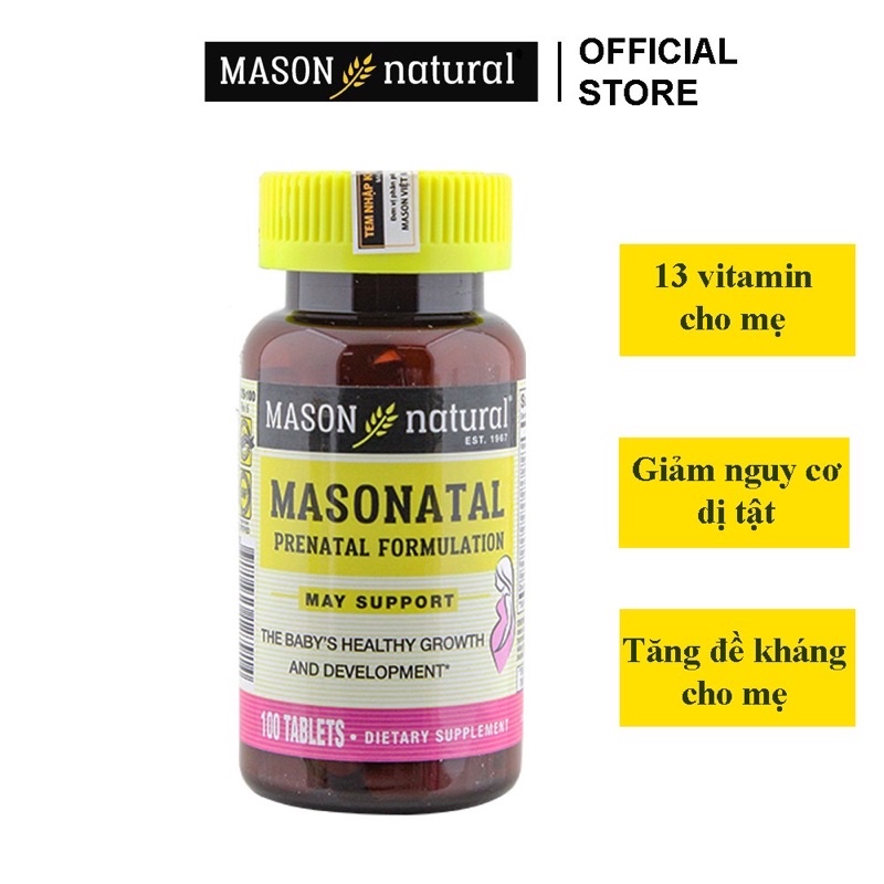 ĐẶC ĐIỂM NỔI BẬT CỦA SẢN PHẦM: - Là loại vitamin tổng hợp cổ sung đầy đủ 13 loại vitamin và khoáng chất thiết yếu cho mẹ bầu và thai nhi, khỏa lấp khoảng trống vitamin trong chế độ dinh dưỡng hàng ngày. Thành phần của sản phẩm có nguồn gốc từ thiên nhiên, an toàn cho mẹ bầu và thai nhi trong quá trình sử dụng. - Là sản phẩm chăm sóc sức khỏe chất lượng cao của thương hiệu thực phẩm chức năng hàng đầu nước Mỹ Mason Natural. Thương hiệu Mason Natural là thương hiệu chuyên cung cấp các sản phẩm chăm sóc sức khỏe hàng đầu tại Mỹ với hơn 50 năm kinh nghiệm xây dựng uy tín. - Sản phẩm đạt tiêu chuẩn CGMP và ASI Hoa Kỳ.