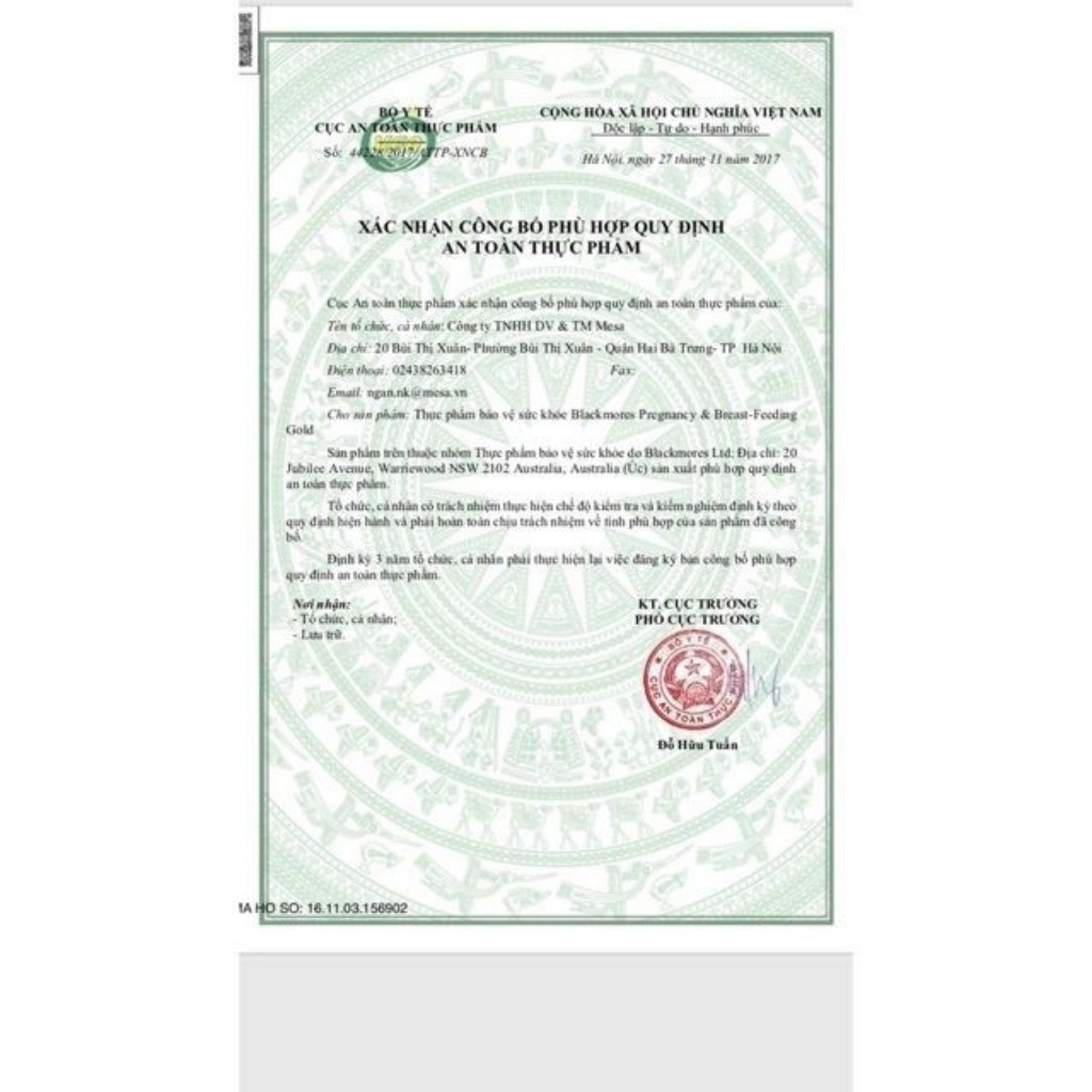 A. giới thiệu Vitamin tổng hợp bầu Blackmore Pregnancy của úc 180 viên: ★ Bao gồm 20 Vitamin và khoáng chất thiết yếu rất tốt cho phụ nữ chuẩn bị mang thai, đang mang thai và cho con bú ★ Iot cần thiết cho sự phát triển bình thường của não trẻ, khả năng nhìn và nghe ★ Axit Folic làm giảm nguy cơ sinh khuyết tật não hay tủy sống ★ DHA, Axit béo Omega-3 giúp phát triển của não bộ và thị giác Blackmores Pregnancy and Breast-Feeding Gold đã được phát triển dựa trên nhu cầu dinh dưỡng của phụ nữ mang thai và cho con bú tại Úc để giúp hỗ trợ bổ sung dinh dưỡng dưới dạng một viên nang nhỏ dễ nuốt hơn. Sản phẩm chứa 20 chất dinh dưỡng quan trọng bao gồm 12 vitamin, 7 khoáng chất và acid béo omega-3 không mùi. Ngoài ra sản phẩm còn cung cấp lượng iod và acid folic hàng ngày dựa trên hướng dẫn bổ sung cho phụ nữ mang thai. B. Thành phần chính Vitamin tổng hợp bầu Blackmore Pregnancy của úc 180 viên: - Sắt ở dạng sinh học để hình thành hemoglobin, vận chuyển oxy đến các mô - Iod giúp phát triển trí tuệ, kỹ năng vận động và thính giác của em bé - Acid folic với liều hàng ngày 500 μg. Nếu dùng hàng ngày trong một tháng trước khi thụ thai và trong thời kỳ mang thai có thể làm giảm nguy cơ phụ nữ có con bị dị tật bẩm sinh - DHA giúp phát triển trí tuệ, thị lực cho em bé - Vitamin D3 giúp phát triển xương và răng chắc khỏe