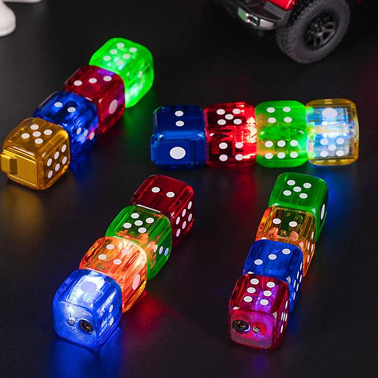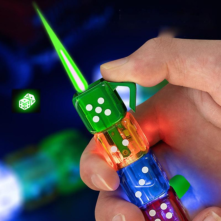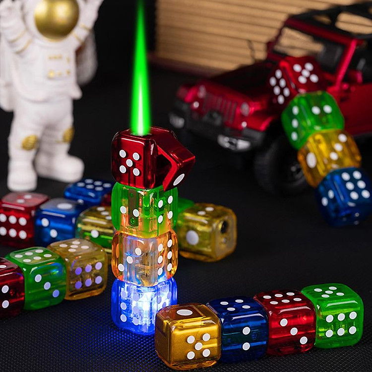 Đặc điểm: Thân bật lửa với hình dáng 4 chiếc xúc xắc nhiều màu trong suốt nhìn thấy được kết cấu bên trong bật lửa. Có đèn led nổi bật.