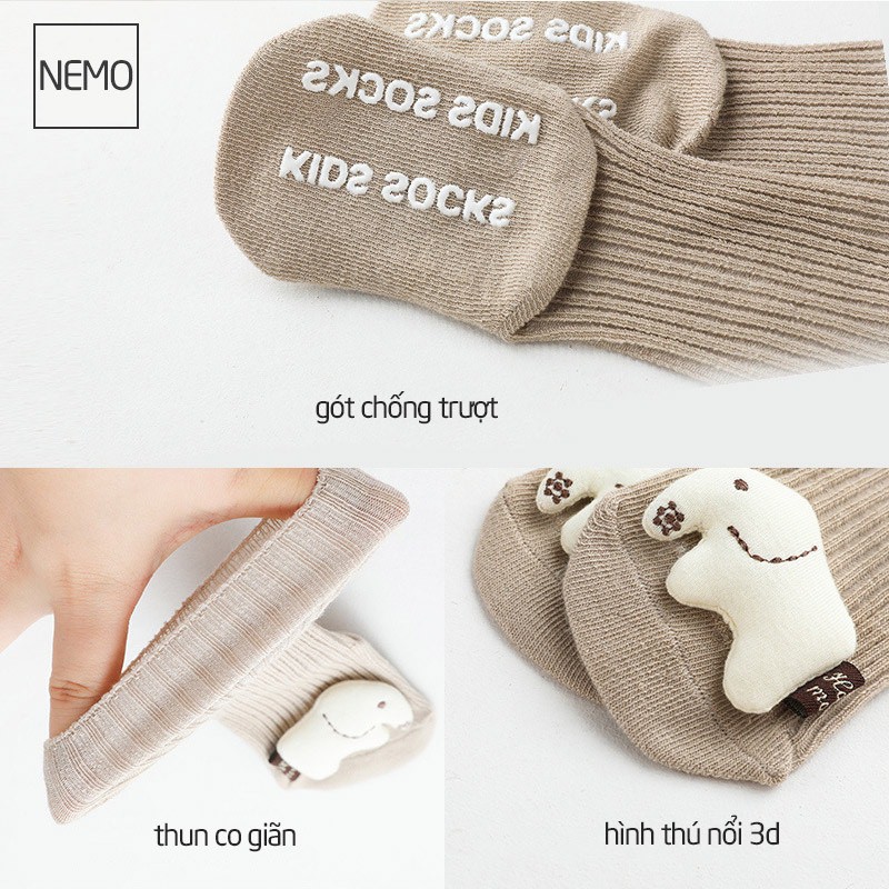 Ở trẻ nhỏ, mẹ cũng hay cho trẻ đi tất thường xuyên bởi lúc này trẻ chưa thể tự điều chỉnh thân nhiệt mình vì thế trẻ rất dễ bị sốc nhiệt và cảm lạnh 1- Thông tin chi tiết Tất trẻ em cao cổ hình thú 3D Nemo Chất liệu: thun cotton Size: S:0-1 tuổi, M: 1-3 tuổi Tất cao cổ