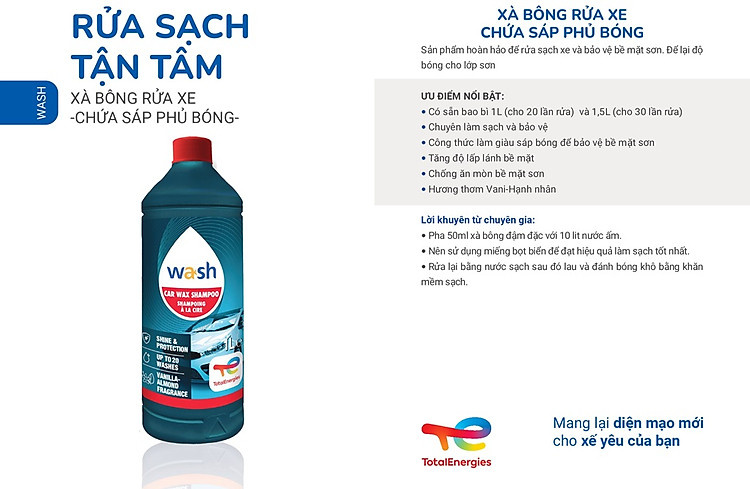 Bạn có biết chỉ cần sử dụng Xà bông rửa xe có chứa sáp phủ bóng sơn xe 2in1 Total Energies TE-CW1L là bạn đã có thể tẩy rửa tất cả bụi bẩn bùn đất bám trên xế yêu một cách an toàn và tiết kiệm.