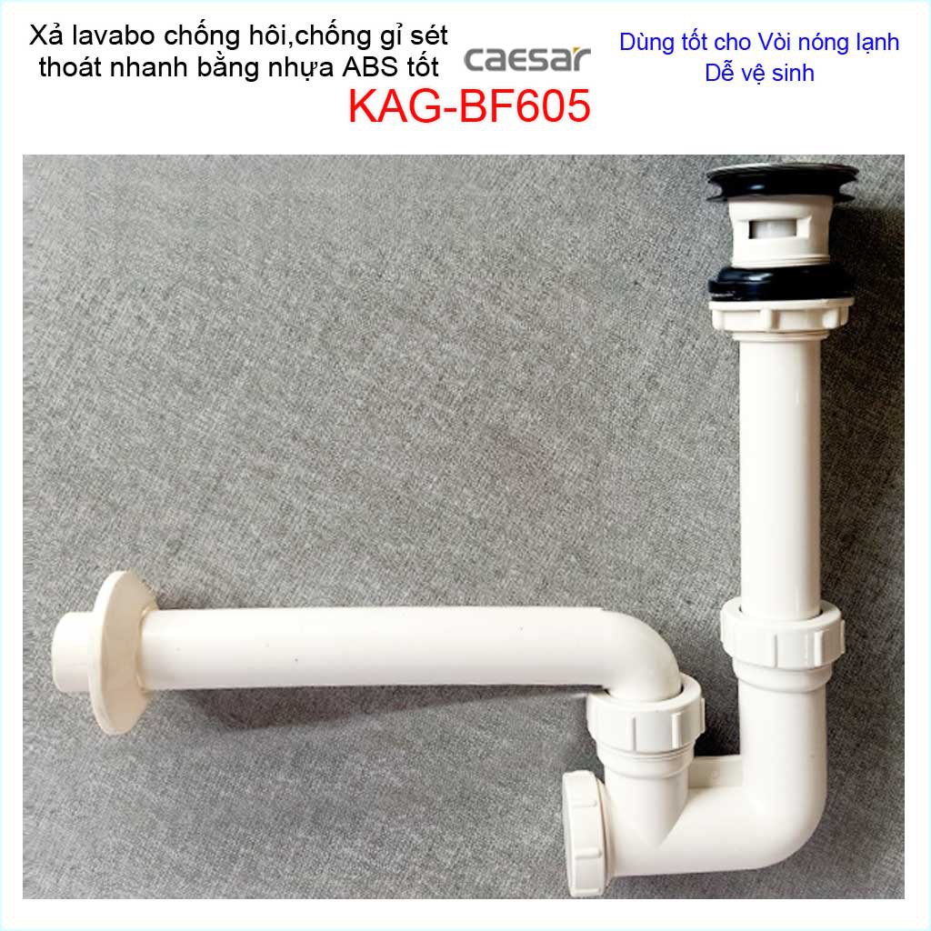 Bộ xả nhấn nhựa Caesar, bộ xả lavabo cho chậu rửa mặt sứ KAG-BF605 sản xuất bởi công ty thiết bị vệ sinh Caesar Đài Loan, đầu xả bọc bằng inox 304, ống thải sản xuất bởi nhựa cao cấp ABS, chống ố vàng, sử dụng tốt cho mọi vùng miền, nhất là các vùng nước phèn, vùng biển mặn, không bị ô xi hóa