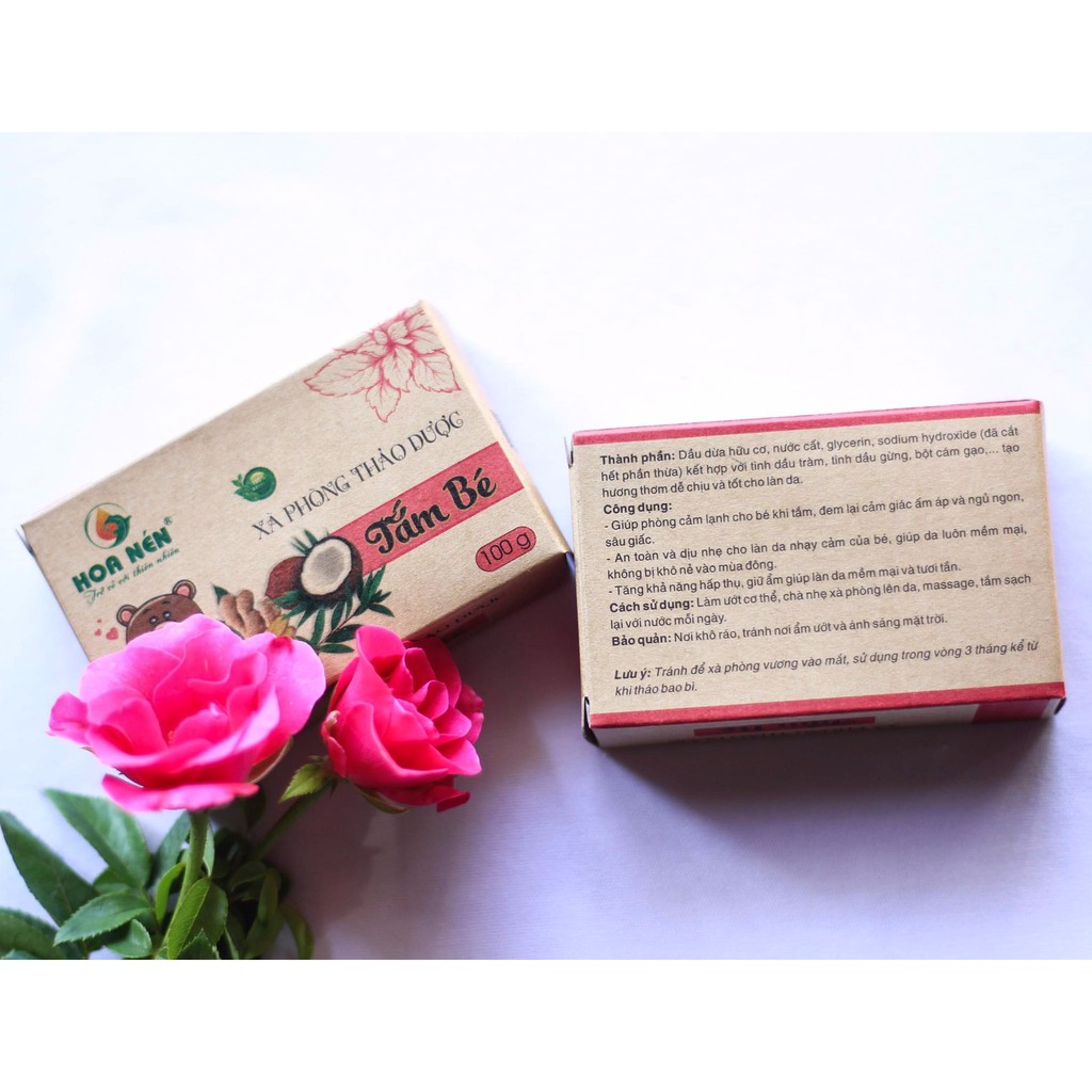 Xà phòng thảo dược thiên nhiên cho bé Hoa Nén 100g_Giúp mẹ yên tâm hơn khi tắm cho bé ----- 🍀 Với thành phần từ thiên nhiên và sản xuất bằng phương pháp thủ công tích hợp tinh dầu và các bột dược thảo thiên nhiên hoàn toàn không có chất tẩy rửa như các loại xà phòng trên thị trường, sử dụng rất tốt cho làn da, đặc biệt là làn da em bé. 🍀 Xà phòng thảo dược Hoa Nén còn chứa một lượng nhỏ Glycerin giúp giữ ẩm da kết hợp với tinh dầu thiên nhiên sẽ tạo cho bạn cảm giác khác biệt khi tắm bằng các loại xà phòng khác.