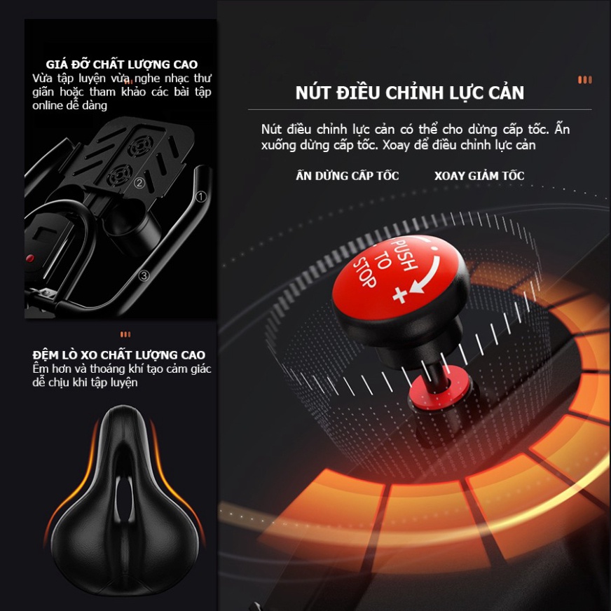 Ưu điểm nổi bật xe đạp tập Hệ thống giảm xóc vượt trội Thấu hiểu nỗi lo lắng đạp xe cường độ cao có thể dẫn tới sự xóc, nảy, dòng xe đạp tập mới ra đời đã được cải tiến hệ thống giảm xóc bằng lò xo dưới yên xe. Cải tiến mới này giúp xe luôn giữ ổn định, không rung lắc và mang tới người tập cảm giác thoải mái tuyệt đối. Dây curoa hoạt động êm ái Không nhiều dòng xe đạp tập hiện nay sử dụng dây curoa trong động cơ như nó. Dây curoa của xe được nghiên cứu và chế tạo riêng bằng những dòng vật liệu mới có độ bền lớn và khỏe, chịu được tác động lực lớn. Khác với hệ thống dây xích, loại dây curoa này sẽ giúp xe đạp tập vận hành êm ái, không gây ra tiếng ồn. Đồng thời, không cần phải sử dụng chất bôi trơn mà vẫn hoạt động bền bỉ. Điều này giúp người dùng tiết kiệm thời gian và công sức hơn sử dụng xe đạp tập sử dụng bộ truyền xích thông thường hiện nay. Bàn đạp có thêm đai bảo vệ Đạp xe đạp tập thể dục trong nhà an toàn hơn hẳn so với đạp xe ngoài trời. Và để tăng thêm sự an toàn này, xe đạp tập còn được ưu ái cấu tạo thêm đai bảo vệ phía trên bàn đạp. Bạn hoàn toàn có thể yên tâm sử dụng thiết bị xe đạp tập cho cả những người cao tuổi hay trẻ em mà không cần phải lo lắng vì bất kỳ điều gì. Thiết kế đẹp, chắc chắn, cao cấp Xe đạp tập SPINING GH 806 được cấu tạo từ khung sườn thép không gỉ, vô cùng chắc chắn và chịu lực tốt. Bên ngoài sản phẩm bọc lớp nhựa ABS cao cấp. Yên xe được tạo nên từ nệm êm ái và có cơ chế thoát khí tự động để mang đến cho bạn những giờ phút thư giãn hoàn toàn thoải mái. "