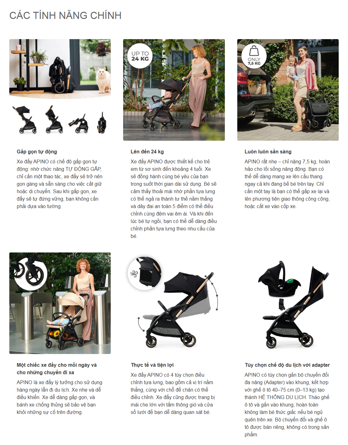 • Có tùy chọn gắn bộ chuyển đổi đa năng (Adapter) vào khung xe để gắn với ghế ngồi ô tô cho bé (0-13 kg). Tháo ghế ô tô và gắn vào khung, hoàn toàn không làm bé thức giấc nếu bé ngủ quên trên xe