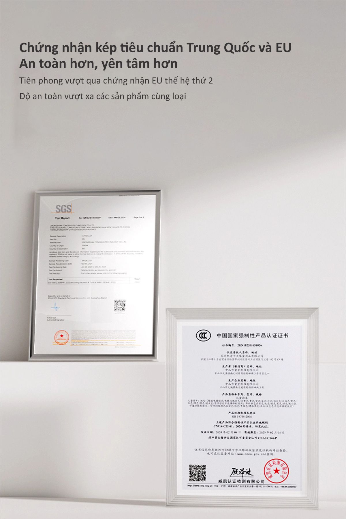 • An toàn tuyệt đối: Đạt chứng nhận an toàn nội địa Trung Quốc 3C & Châu Âu EN1888.
