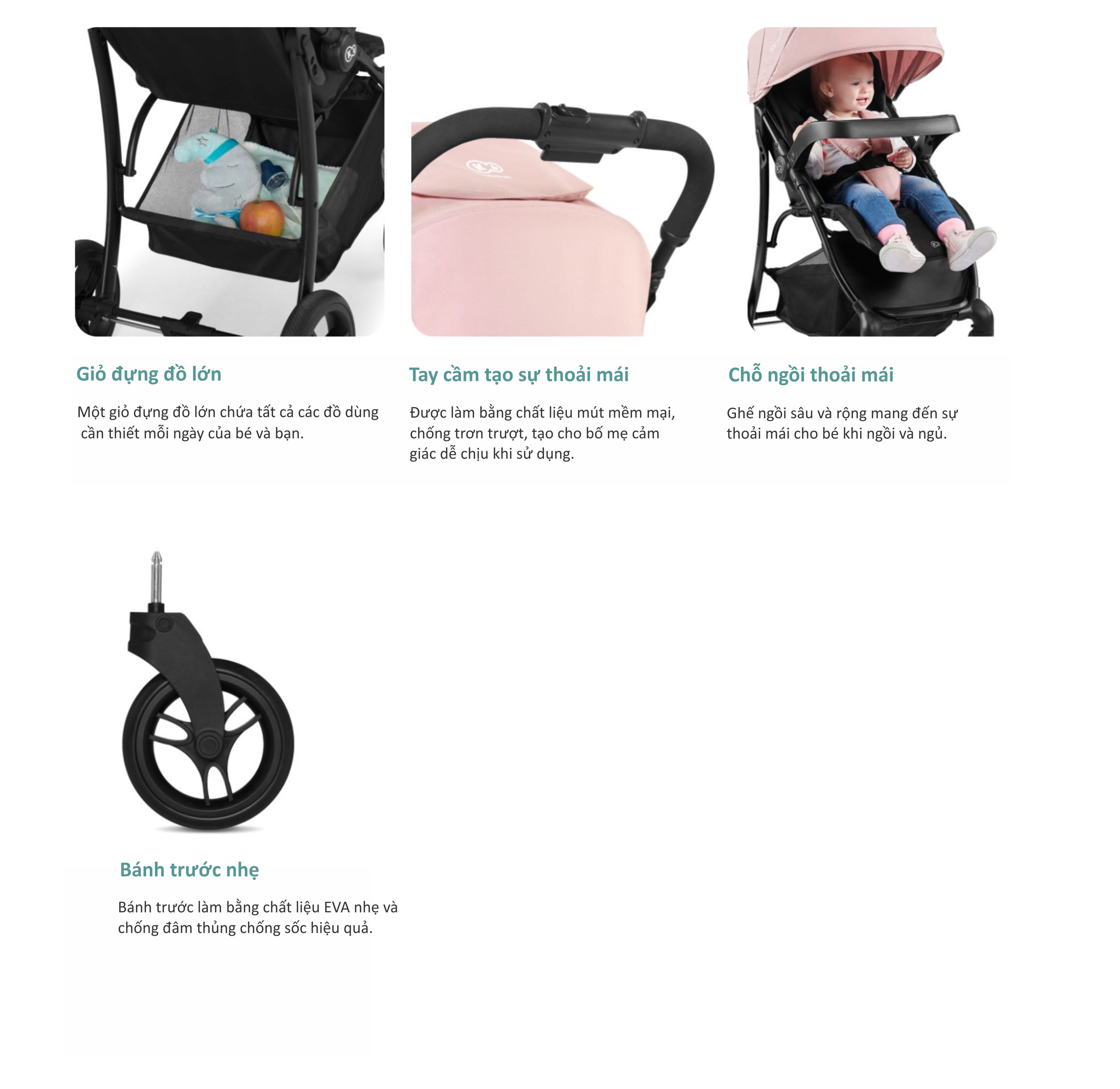 | Kích thước | • Tải trọng: 15 kg• Trọng lượng xe: 9,53 kg• Kích thước: 51 x 87 x 106 cm• Kích thước gấp gọn: 51 x 34 x 86 cm• Màu sắc: ghi, hồng nhạt, đen (not available)• Đạt tiêu chuẩn an toàn Châu Âu EN 1888 |