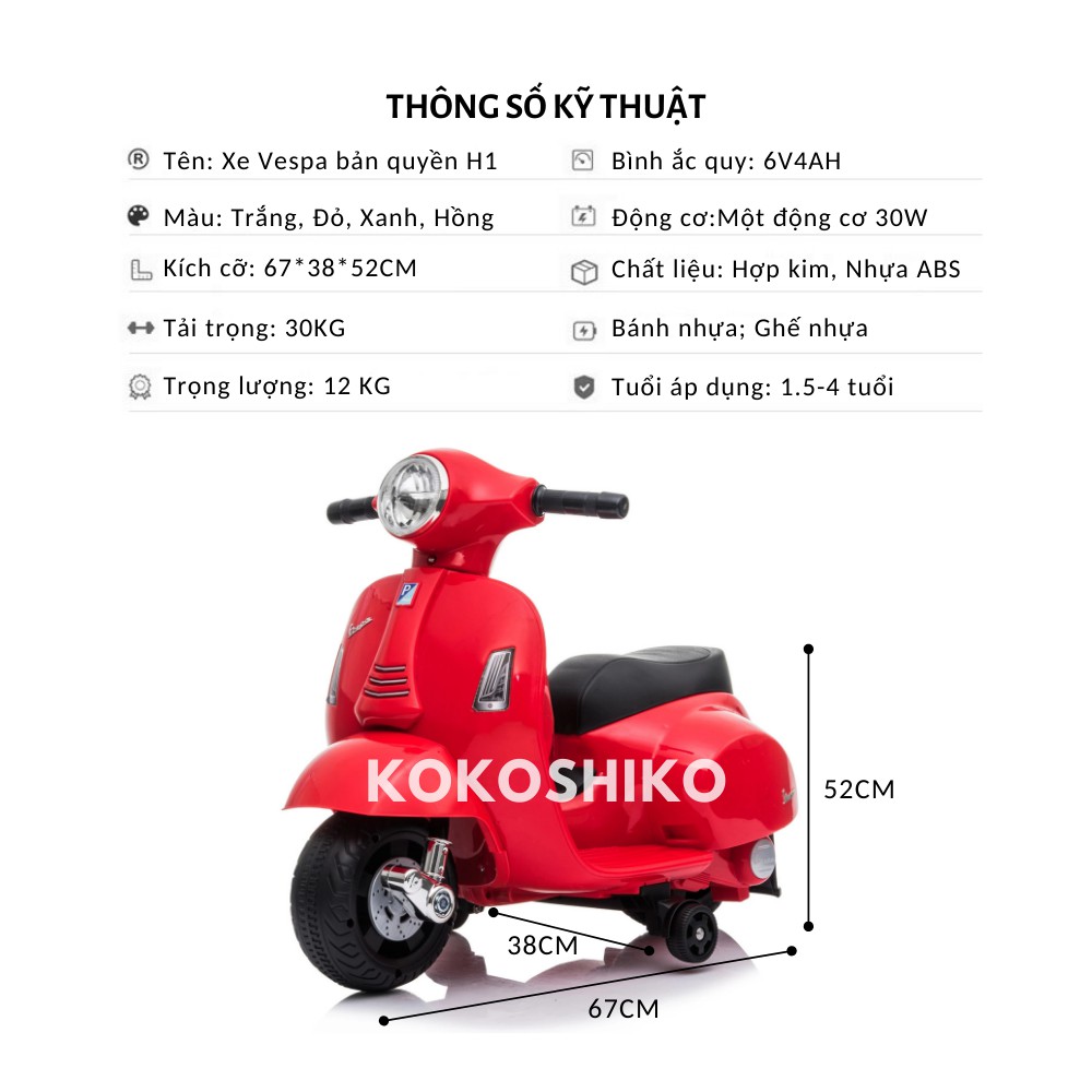 Mô tô điện cho bé Mã hàng: Vespa H1 • Xe mô tô Vespa hàng bản quyền • Phiên bản mini cho bé dưới 4 tuổi • Bình ắc quy: 6V4AH • Chân ga nhậy, tăng tốc từ từ • Màu sắc: Hồng/ Trắng / Đỏ/ Xanh • Chất liệu: Hợp kim nhôm, Nhựa nguyên sinh • Bánh nhựa bám đường, chống trượt • Ghế nhựa rộng rãi, thoải mái • Kích cỡ: 67*38*52CM • Cân nặng: 12KG • Tải trọng: 30KG • Tuổi áp dụng: 1.5-3 tuổi • Đóng gói nguyên thùng