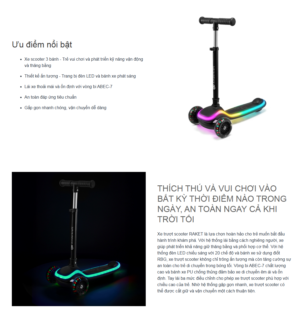 • Thiết kế ấn tượng với hệ thống đèn LED rực rỡ trên cả sàn xe (với 20 chế độ màu) và bánh xe phát sáng, đảm bảo bé luôn nổi bật và an toàn khi chơi đùa