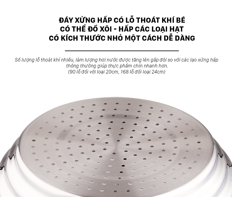Với phần nắp của xửng hấp, được thể kế theo hình tròn, đường viền bên ngoài được dập đúc theo các size sao cho vừa khớp với ngăn hấp của xửng. Giups đảm bảo xửng có thể đậy kín hơi để thực phẩm có thể chin nhanh. Phần tay cầm nắp được cách nhiệt chống nóng, bỏng khi cầm nắm sản phẩm.
